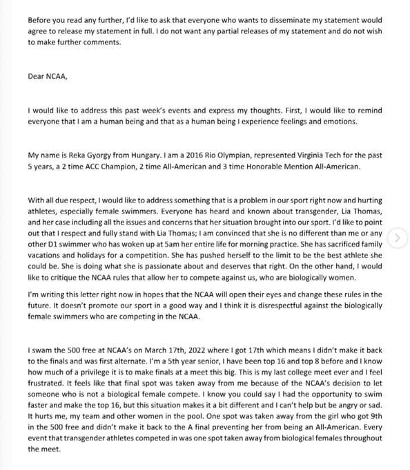 Studies show that the physical differences between the two genders consistently give males a biological advantage over similarly gifted females.